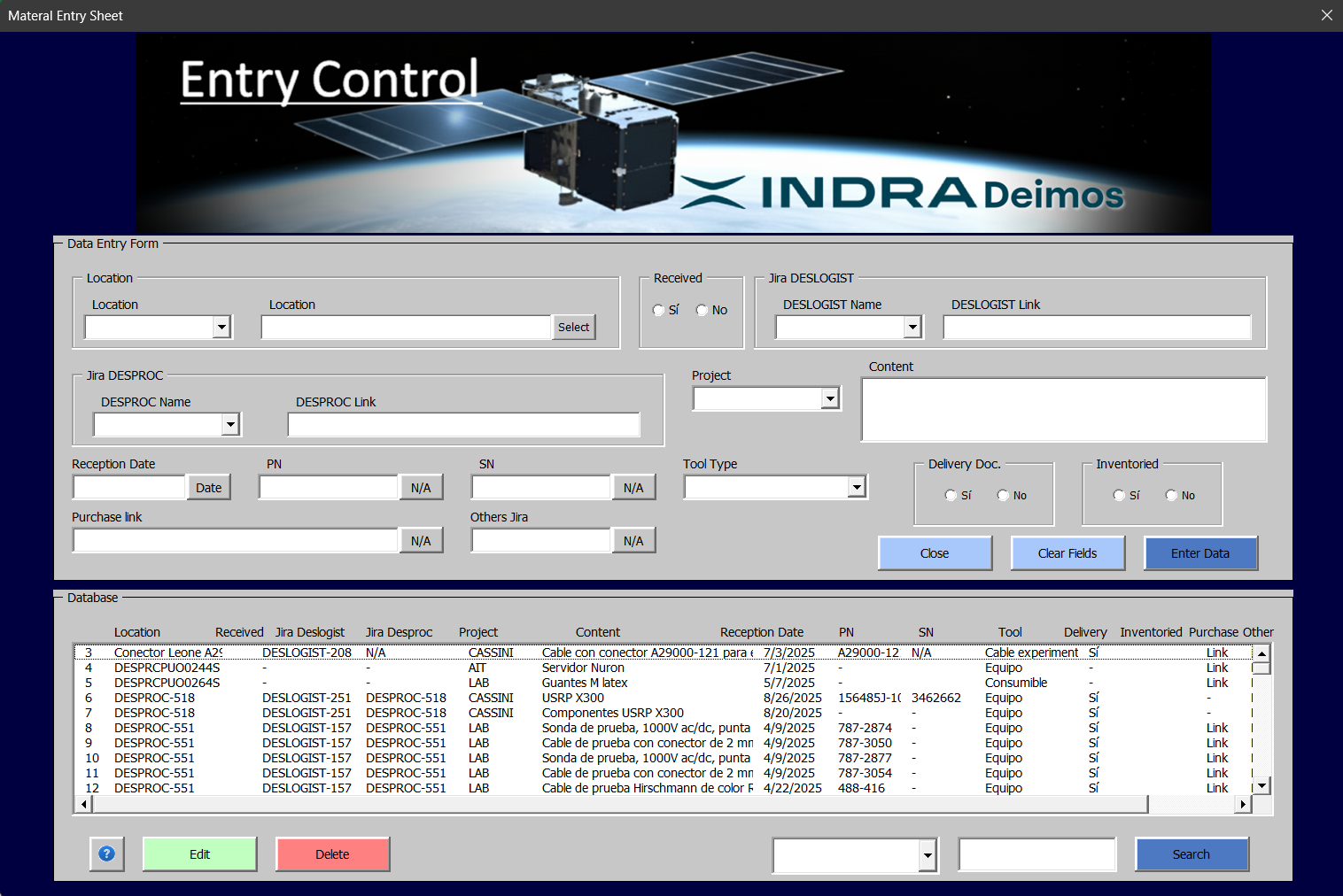 Interfaz visual para gestión de Inventarios y Entradas de Equipo. Creado con Visual Basic por Aplications para Excel gestiona y estandariza los registros, edición y borrado de los equipos.