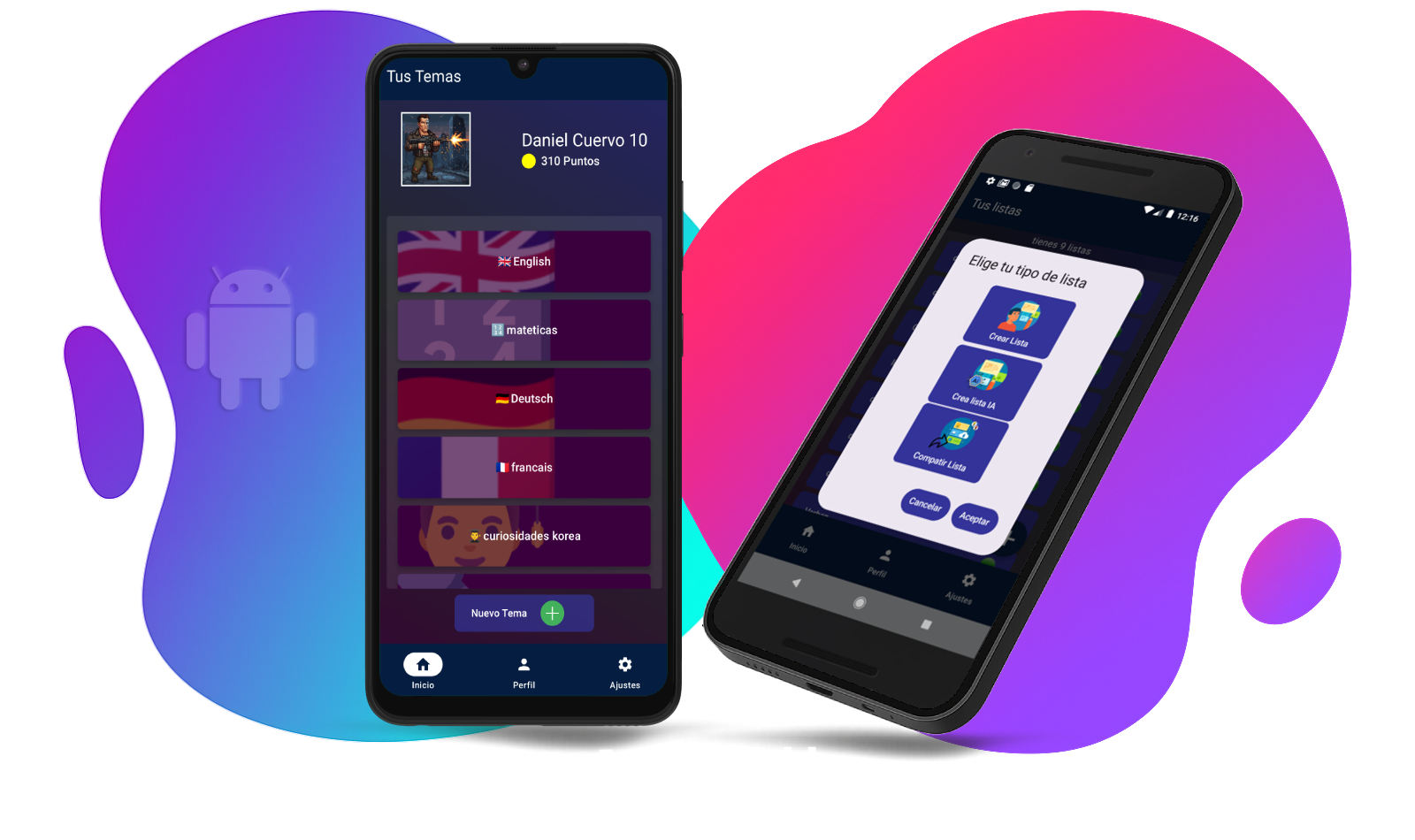 MemoryApp. Permite crear, listas de palabras o conceptos y practicarlos usando el principio de flashcards. Tiene una API REST de IA la cual crea las listas automáticamente partiendo de un tema dado o un texto